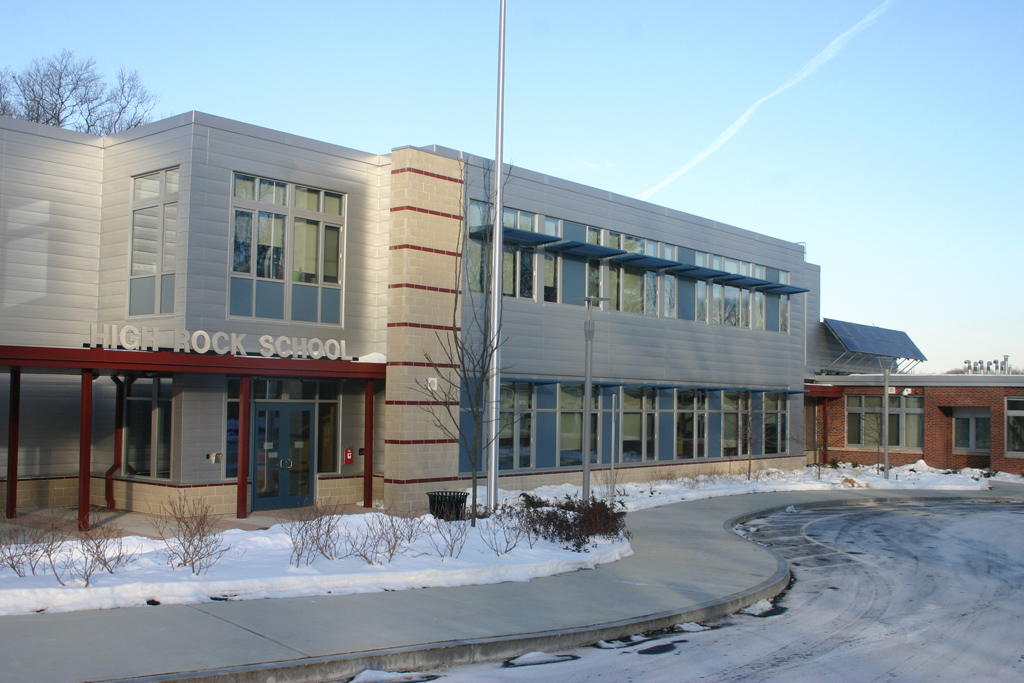 The original plan was to install the solar PV array at the Pollard School. But around that time, it became clear the Pollard School needed a new roof. So after some further research, the decision was made to install the PV array at the new High Rock School. High Rock was alredy under construction, and it was hoped to incorporate the panels into the final stages of the project in time for the opening of the school in September, 2009. Construction schedules and building permit issues prevented that from happening in time for the building’s dedication in October 2009, but by January, 2010, the panels were installed. Within a few months, all the electrical interconnections were complete and the solar array began generating electricity.