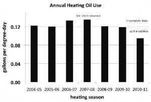 Results: 736 gallons of oil were used for the 2010-2011 heating season, approximately a 20% decrease as compared to past years. Biggest savings appeared to have come from insulation.