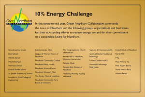 “The plaque symbolizes the fact that there are many paths to the goal of cutting energy use,” said Eleanor Rosellini, one of the coordinators of Green Needham’s 10% Energy Challenge campaign. “The diversity of Needham businesses honored on the plaque – Koko FitClub of Needham, North Hill, Muzi Motors, Petit Robert Bistro, PTC, Stone Hearth Pizza and Volante Farms – is proof tht opportunities for cost-effective energy savings exist in almost every setting.”