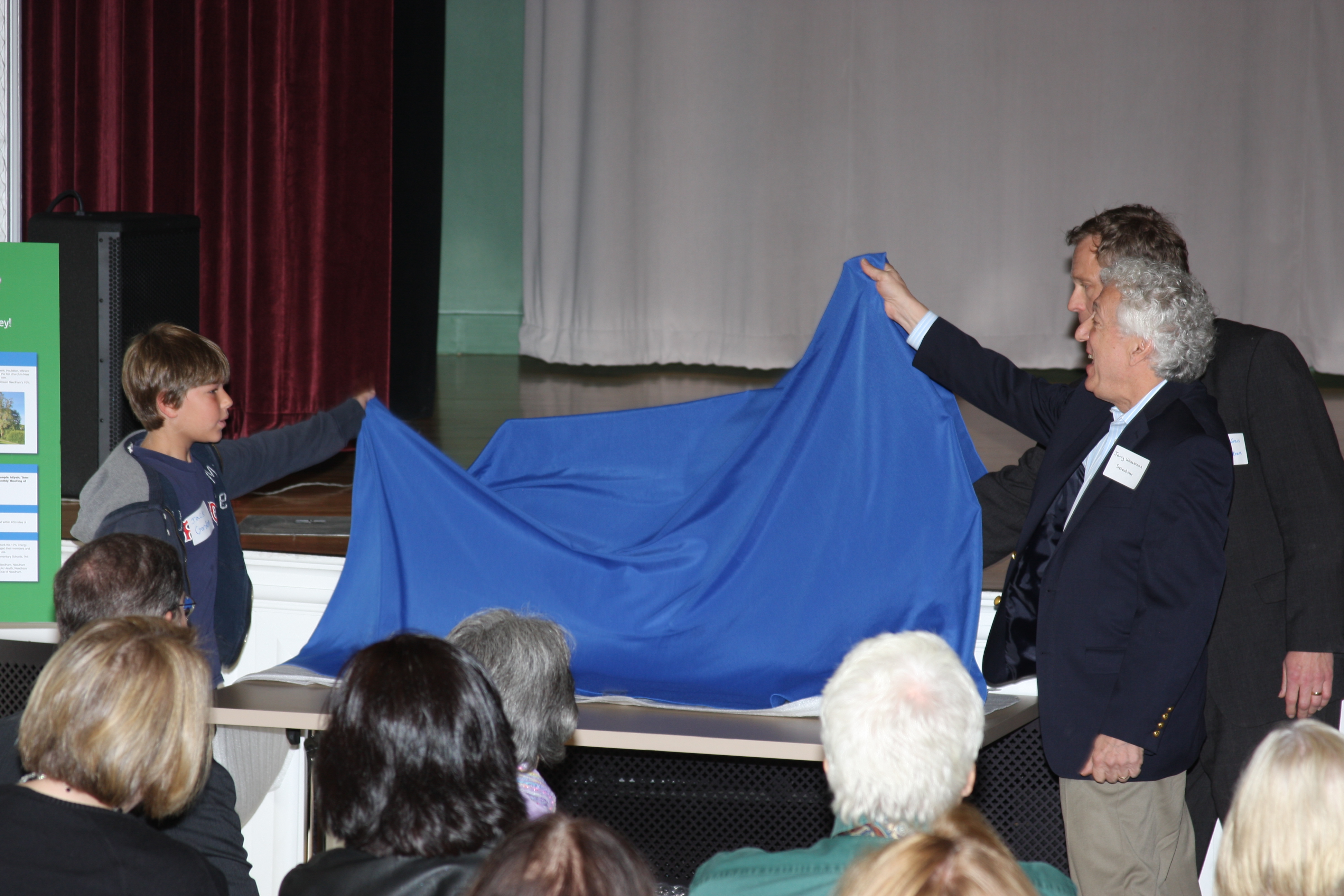 Eliot 4th grade student Jack Gordon and Selectman Jerry Wasserman unveil the 10% Energy Challenge Plaque.