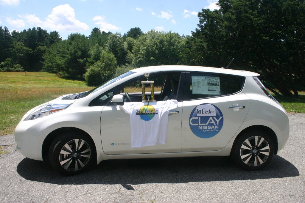 Since the Leaf is all electric, none of our marchers had to breathe hot exhaust fumes from a tailpipe – a bonus on a hot, sunny summer day. Green Needham thanks Clay Nissan of Newton for providing the all-electric Leaf for us to drive in the parade.