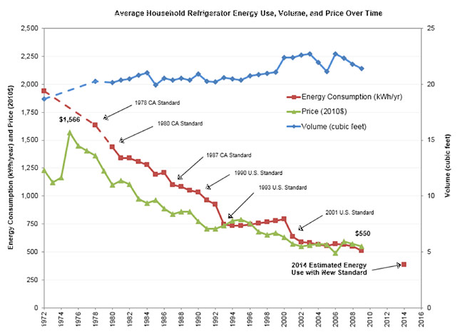 The new efficiency measures are the latest in a series of standards over 40 years that have helped to significantly bring down the cost of running a typical refrigerator. A fridge that just meets the new standards will use $215 to $270 less per year in electricity than a comparable unit that met the first state standards set in 1978.