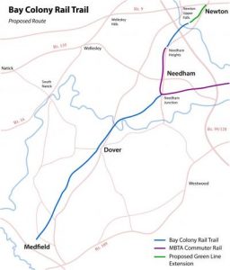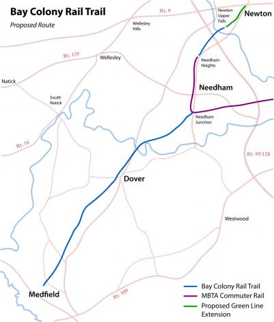 The Bay Colony Rail Trail (BCRT) is a proposed 7-mile multi-use trail through the towns of Needham, Dover and Medfield. The goal of the BCRT project is to construct a multi-use trail (or rail trail) along the unused section of railroad Right-of-Way (ROW) owned by the Massachusetts Bay Transportation Authority (MBTA). An overview map of the regional BCRT corridor is shown at right (click map for larger version).