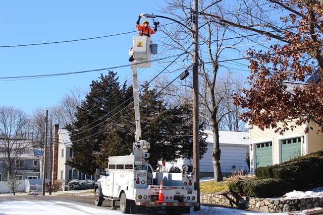 Workers are currently servicing lights in the Needham Heights and will move from there accordingly. Their vehicles and clothing are marked with the Dagle Electric logo.