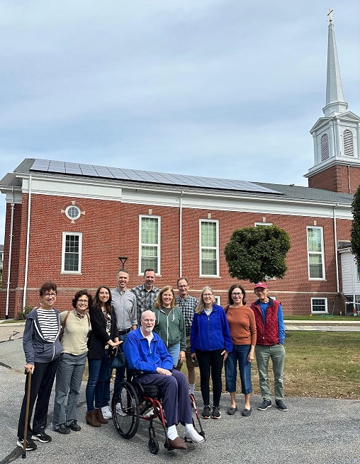 Unfortunately, Deb passed away in May, 2023, but her work continued. With money raised in her memory, and a low-interest Cornerstone Loan via the United Church of Christ, the panels final became a reality and were installed in July 2024. Deb Baldwin’s husband, John, activated the solar array on September 28th by “throwing the switch.” The Church celebrated the installation on September 29th with John Baldwin and his two sons, Ian and Keith. The 68-panel, 28.56kW DC system will reduce the Church’s yearly carbon footprint by 23,000 lbs., offsetting its current electrical usage. After the Cornerstone Loan is repaid in 5 years, the church will save approximately $350,000 to $400,000 during the 25-year solar panel warranty period.