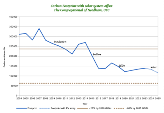 Because of the many sustainable actions taken, the Church has reduced its carbon footprint by 64% since 2004, as demonstrated by the graph below. The Church currently has a Level III Green Church Congregation designation from the United Church of Christ, and will be applying for the highest level – level IV.