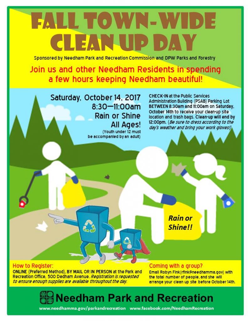 Needham Park and Recreation and DPW Parks and Forestry have teamed up to sponsor another incredible Town-Wide Clean-Up day and we hope you will join us Saturday, October 14th , to help keep Needham beautiful!  We’d love to have individuals, families, groups, clubs, teams, and neighbors join us for a morning of beautifying Needham.  If you are a part of any clubs, groups, or teams, be sure to share the flyers with them and have them join us too! Register online –  under the “For Residents” option choose “Park and Recreation On-line registration.”  Scroll down to choose “Town Wide Clean Up Day.” All ages are welcome to attend and all children under the ages of 12 must be accompanied by an adult.  Rain or shine.  For further information please call the Park and Recreation Office at (781) 455-7550 Ext. 3.