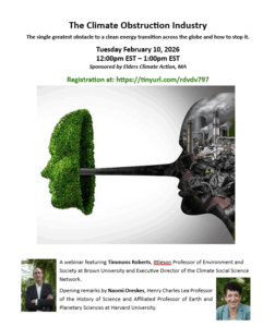 On Tuesday, February 10, at noon, Elders Climate Action, MA will host a webinar, The Climate Obstruction Industry, on the important topic of climate deception. The speaker will discuss the well-financed, global effort to thwart climate policy using disinformation, and what we can do about it. Register for the webinar here. Learn more here.