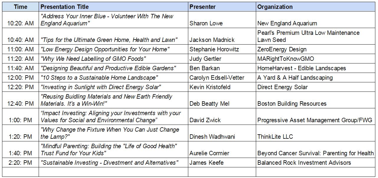 We will have over 40 exhibitors demonstrating, sharing, informing and playing. In addition we have a fascinating set of lightning-quick 10 minute presentations. There is a wide range of interesting subjects like landscaping, investing, lighting, growing food and more. Below is the current schedule, and check back nearer the day as times may change.